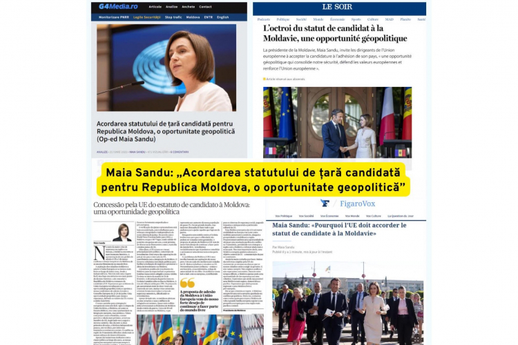 President Maia Sandu said the granting of the EU candidate status to the Republic of Moldova is a geopolitical opportunity. “The aspirations of the citizens of the Republic of Moldova to join the European Union became stronger during the 30 years of independence. It wasn’t a smooth path, but today we are at the point when a historic decision is to be taken: granting of the candidate status to the Republic of Moldova,” President Sandu stated in an Op-Ed that was published by G4Media, El Pais, Le Figaro, Die Welt, Le Soir, Gazeta Wyborcza, Publico and La Repubblica, IPN reports.