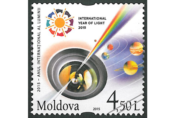Marca poştală „2015 – Anul Internaţional al Luminii” reprezintă un obiectiv prin care sunt reflectate culorile spectrului pe fundalul Universului. Marca are valoarea nominală de 4,50 lei şi este emisă într-un tiraj de 200 de mii de exemplare.