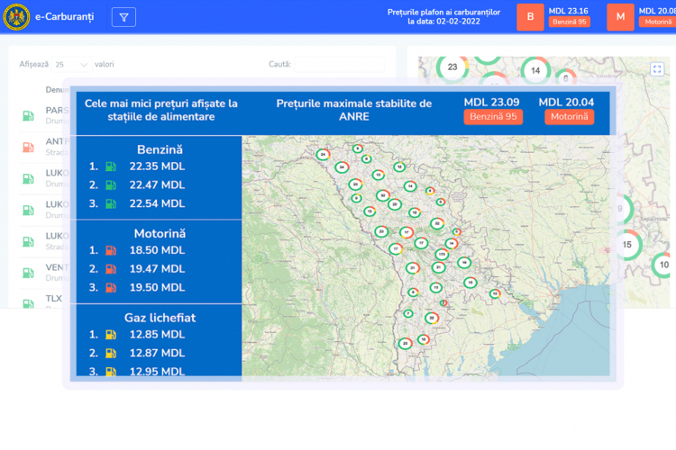 Национальное агентство по регулированию в энергетике запустило платформу „e-Carburanți”, которая представляет собой интерактивную карту с информацией о ежедневных ценах на основные нефтепродукты стандартного типа и сжиженный газ, передает IPN.