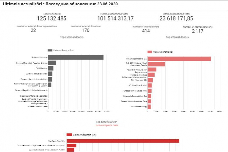 Визуализация данных о пожертвованиях для борьбы с COVID-19 появилась благодаря инициативе Коалиции организаций гражданского общества по соблюдению принципов прозрачности и эффективности использования государственных денег, поддержке Бюро Всемирной организации здравоохранения (ВОЗ) в Республике Молдова в сотрудничестве с Министерством здравоохранения, труда и социальной защиты Республики Молдова.