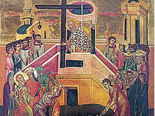 После того как свершились Распятие, Погребение, Воскресение и Вознесение Христовы, св. Крест, послуживший орудием казни Спасителя, был утерян. Обретение Креста имело место в царствование императора Константина Великого. По сообщениям церковных историков IV в., мать Константина, Елена, отправилась по просьбе сына в Иерусалим, чтобы найти места, связанные с событиями жизни Иисуса Христа, а также Крест. Сохранились 3 различные версии предания об обретении Креста. Согласно наиболее древней св. Крест находился под языческим святилищем Венеры. Когда святилище было разрушено, обнаружились 3 креста, а также табличка с Креста Спасителя и гвозди, которыми Он был пригвожден. Другая версия предания об обретении св. Креста, возникшая в Сирии в V в., относит это событие не к III в. и говорит о том, что Крест был найден Протоникой, женой императора Клавдия II (269–270). Третья версия, также, видимо, возникшая в V в. в Сирии, сообщает, что св. Елена пыталась узнать место пребывания Креста у иерусалимских иудеев и, в конце концов, один престарелый еврей по имени Иуда, сначала не хотевший говорить, после истязаний указал место - храм Венеры.